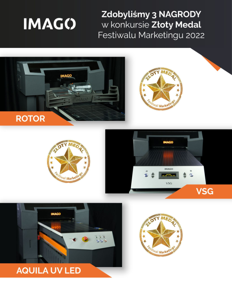 We wrześniu 2022 r. na targach Festiwal Druku zostaliśmy nagrodzeni aż trzema Złotymi Medalami za nasze urządzenie drukujące AQUILA UV LED oraz akcesoria dodatkowe VSG i ROTOR.