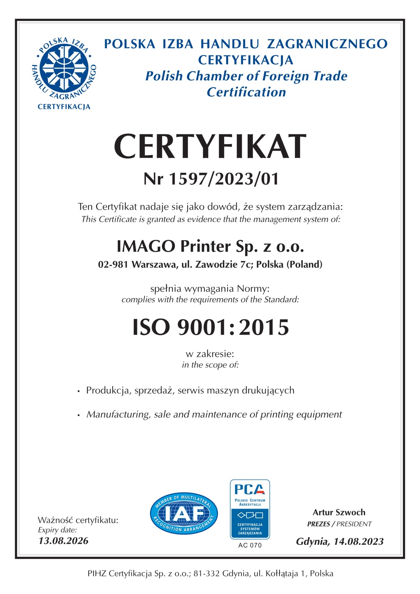 W sierpniu 2023 r nasza firma zdobyła CERTYFIKAT ISO 9001:2015