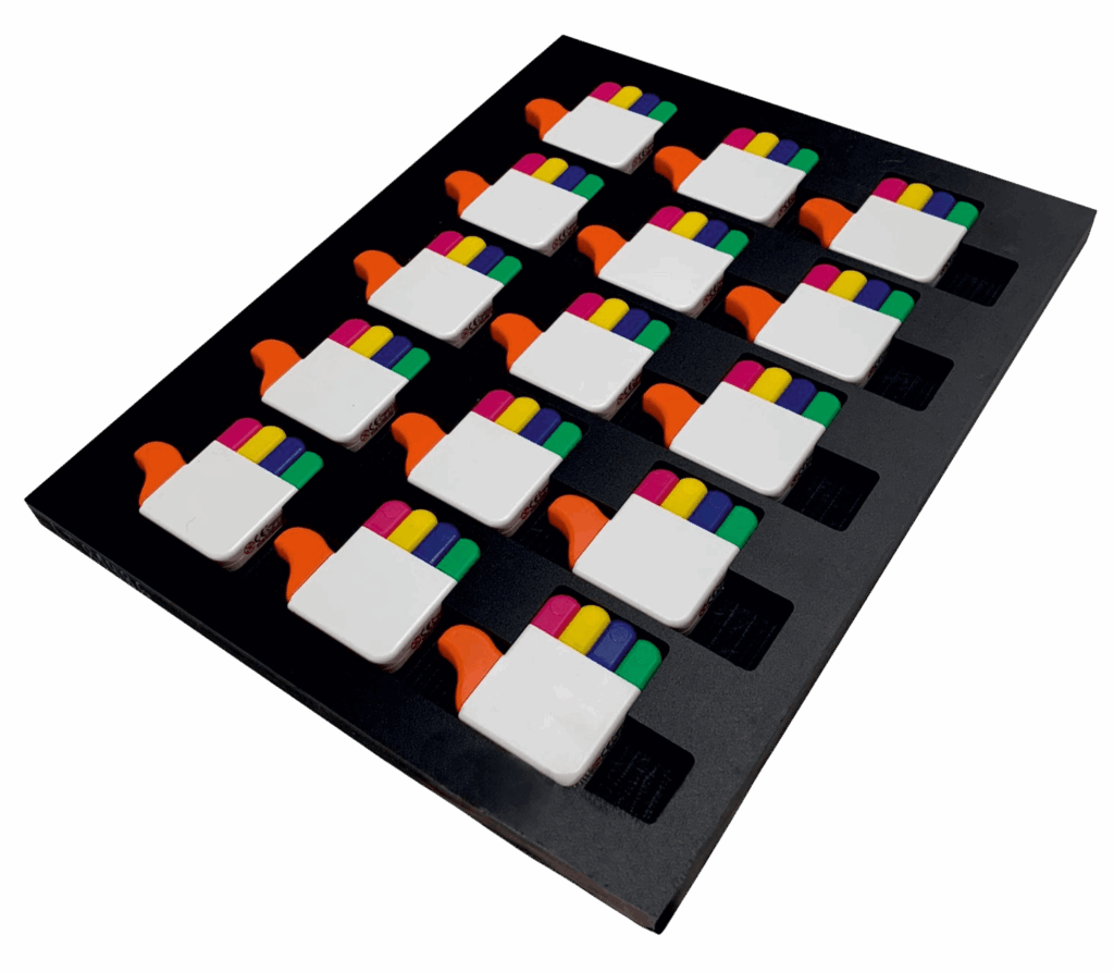 As matrizes simplificam o trabalho e reduzem significativamente os prazos de entrega dos lotes de produtos. Facilitam o posicionamento de dispositivos publicitários, canetas ou pequenos produtos com formas específicas.